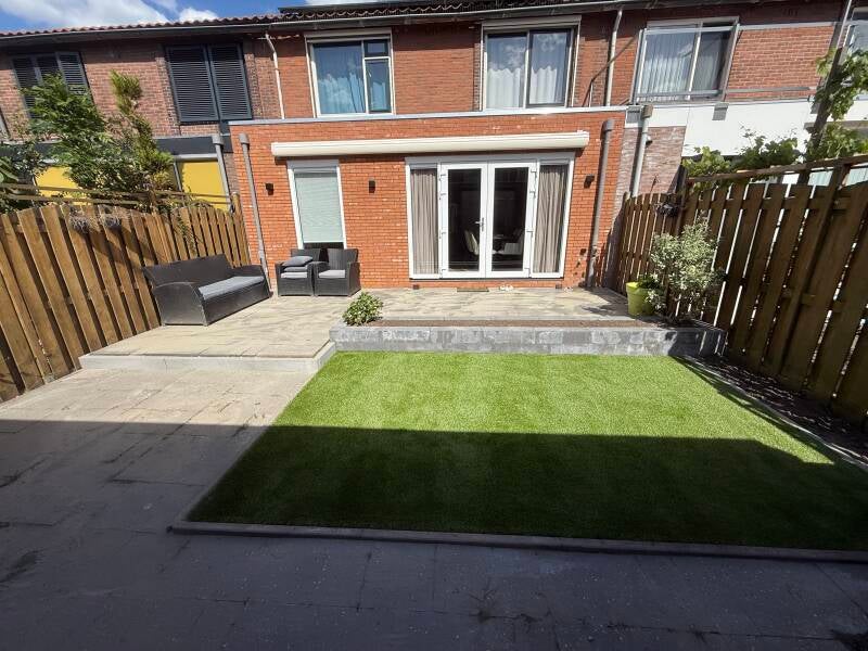 Na het plaatsen van een nieuwe uitbouw moest het terras deels worden opgehoogd.